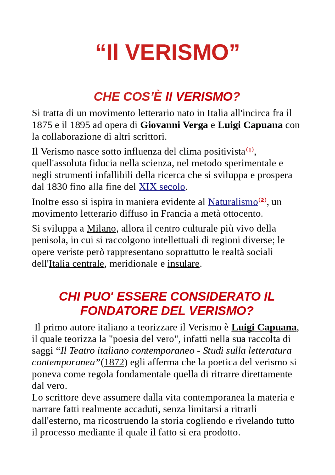 Verismo (Italian for 'realism', from vero, 'true') was an Italian literary movement which peaked between approximately 1875 and the early 1900s. Giovanni Verga and Luigi Capuana were its main exponents and the authors of a verismo manifesto. Capuana published the novel Giacinta, generally regarded as the "manifesto" of Italian verismo. Unlike French naturalism, which was based on positivistic ideals, Verga and Capuana rejected claims of the scientific nature and social usefulness of the movement.